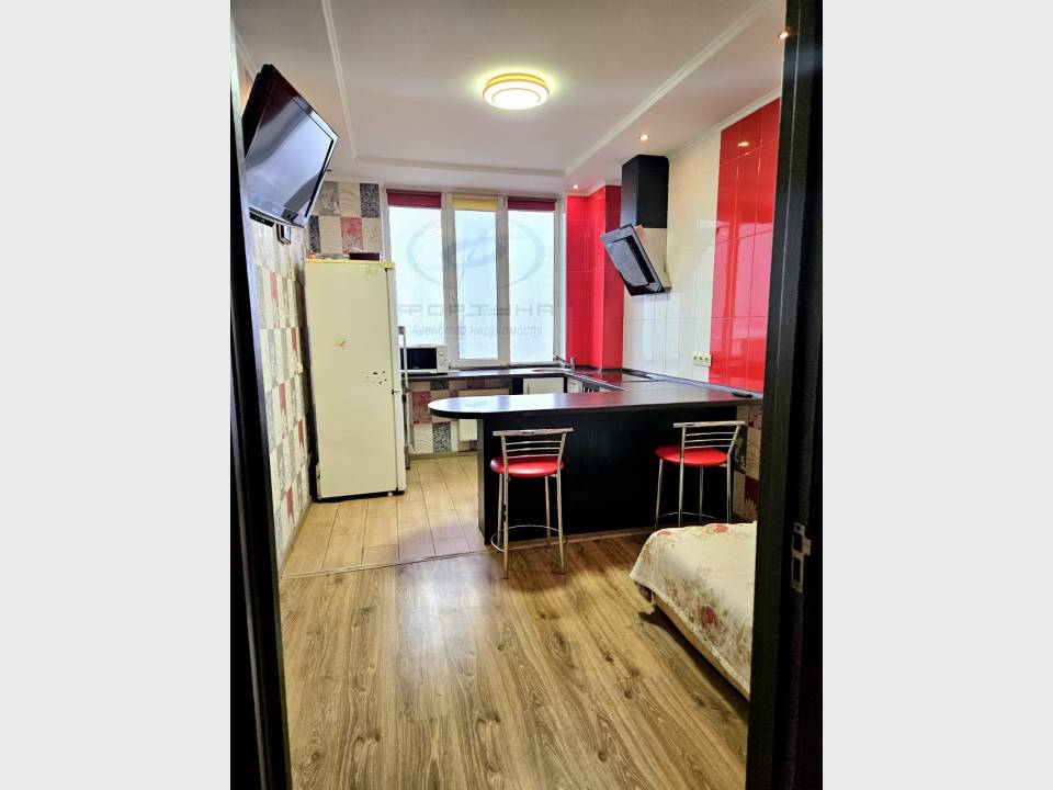 Кухня- вбудована сучасна плитка, оснащена побутовою технікою